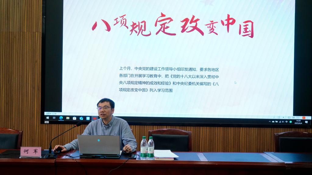 6月4日下午,公司党委常委、副董事长何军以《八项规定改变中国》为题,在文法楼329会议室为球王会、资源加工与生物工程公司和电子信息公司的60余名员工党员带来了一堂生动的党课。