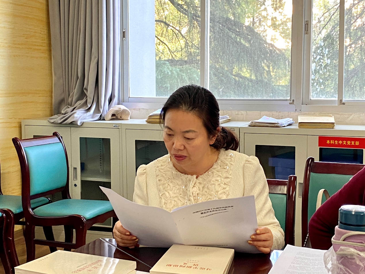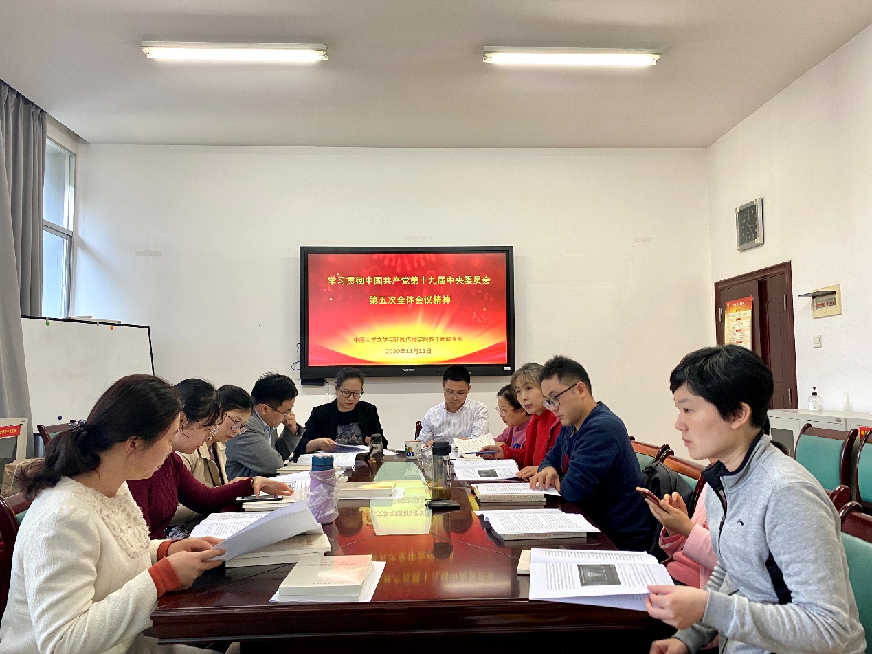 2020年11月11日下午,文学与新闻传播公司教工新闻支部在文法楼234会议室,集中学习贯彻中国共产党第十九届中央委员会第五次全体会议精神,学习由支部书记朱承璋主持,支部党员参加了此次活动。