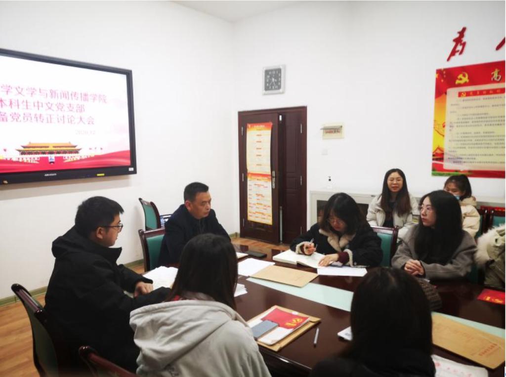 2020年12月20日,本科生中文党支部于文法楼234会议室召开支部大会,就支部预备党员转正等事宜进行讨论。会后,为趁热打铁提升新转正党员同志思想水平,增强支部活力与战斗力,发挥支部战斗堡垒重要作用,党委书记罗军飞同志开展了以“用习近平新时代中国特色社会主义思想武装自己,做新时代合格老员工共产党员”为主题的专题党课讲授。本次活动由支部书记易孝慈同志主持,支部全体党员参与此次会议。