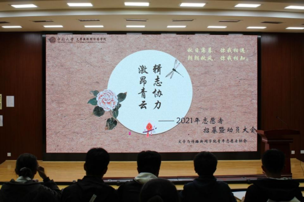 10月16日晚8时,球王会官网文学与新闻传播公司2021年志愿者招募暨动员大会在文法楼222会议室举行。会议由公司青志协干事李依蔚、薛佳主持,2020级辅导员、团委书记易孝慈老师,2021级辅导员、团委常务副书记杨紫金老师,团委副书记程爱琴同学,优秀志愿者代表杨倩瑜同学出席此次会议,部分2021级本科新生参加会议。