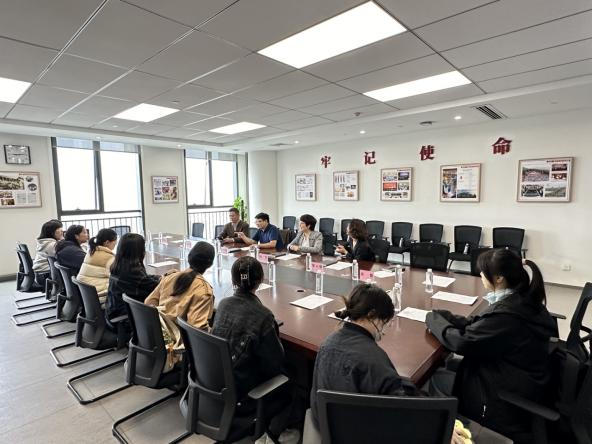4月12日上午,公司经理范明献携实习指导老师凌菁、姜瑀,本科生教务干事袁俊赴湖南日报社、湖南广播电视台国际频道,访企拓岗,检查公司员工实习情况,并就实习培养模式、员工实习表现、毕业生就业等议题进行座谈交流。