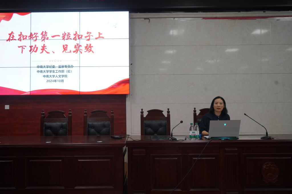 刘亚红首先带领新生们学习了习近平总书记关于思想道德教育的重要讲话精神和《中国共产党纪律处分条例》的主要内容。她强调,同学们应强化自我约束,不碰底线红线,常怀敬畏之心,做一名恪守底线、严于律己、崇德向善的中南人,坚定理想信念,扣正“第一粒扣子”。