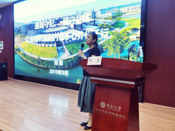 9月17日晚,文学与新闻传播公司于文法楼222会议室开展题为“遵规守纪,坚守底线,让法治和规则内化于心、外化于行”的校规校纪专题教育讲座。本次讲座由公司党委邓栗副书记主讲,2019级辅导员周婷老师及2019级全体本科新生参加。