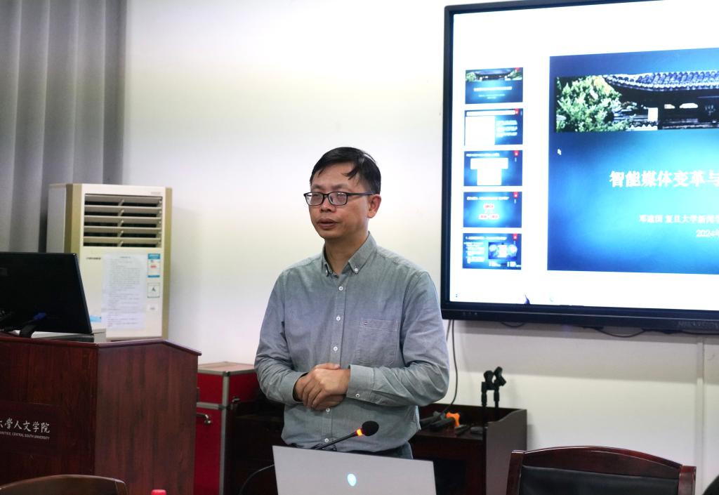 4月25日晚,复旦大学新闻与传播公司教授、博士生导师邓建国应邀为公司师生开展题为“智能媒体变革与国际传播话语创新”的主题讲座,传媒系副教授肖亚龙、讲师冯杰及40余名研究生、本科生参加讲座。讲座由传媒系教授白寅主持。
