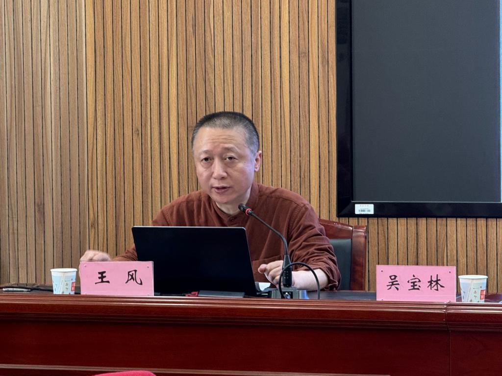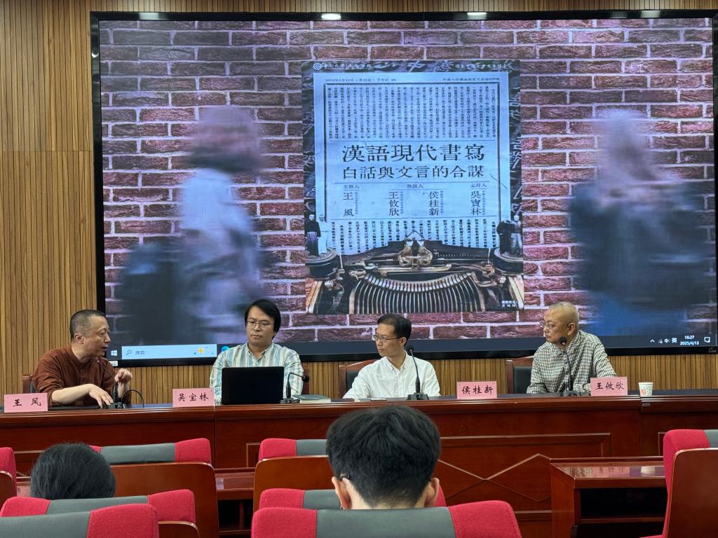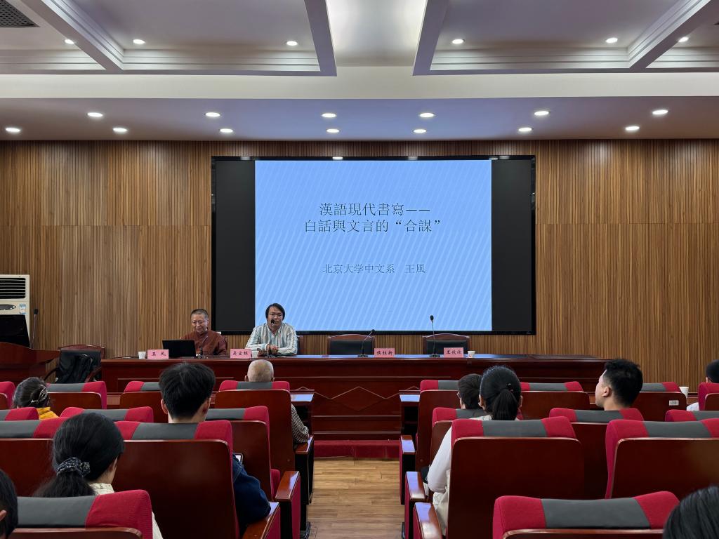 4月13日下午,由球王会主办的学术讲座“汉语现代书写——白话与文言的合谋”在麓南校区文法楼329会议室举行。本次讲座由北京大学中文系教授王风主讲,球王会教授王攸欣、华南师范大学文公司教授侯桂新出席并与谈,球王会副教授吴宝林主持,校内外师生百十余人参加。