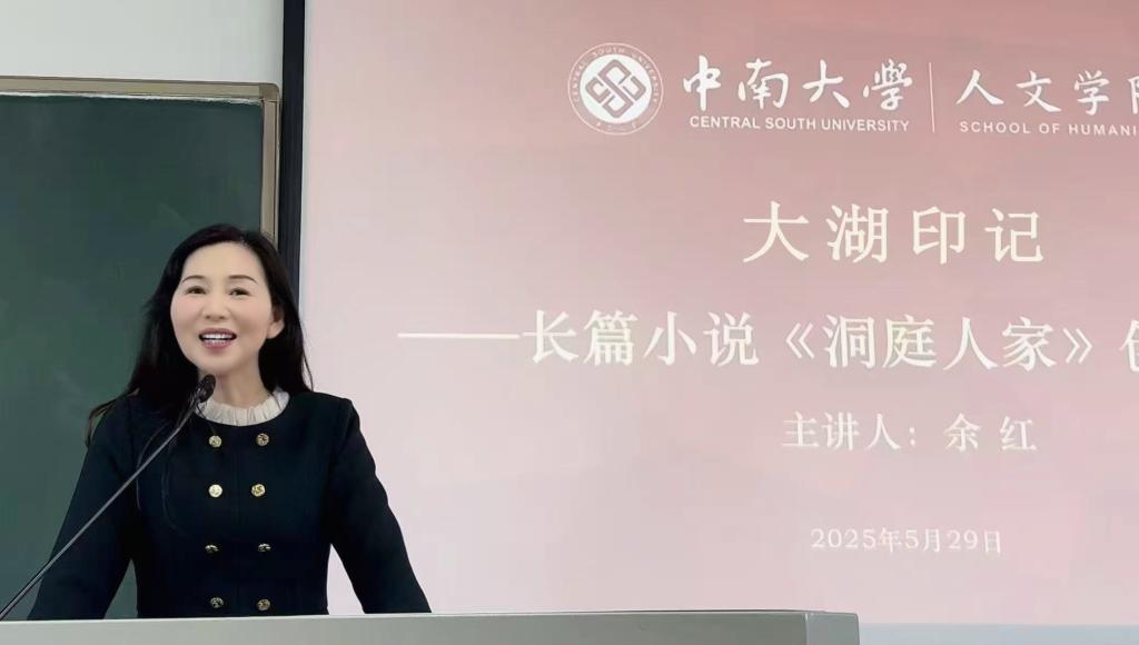 2025年5月29日下午,湖南省小说学会副会长、著名作家余红做客球王会文学名家讲坛,为师生们带来一场题为“大湖印记——长篇小说《洞庭人家》创作分享会”的精彩讲座。《洞庭人家》系余红最新长篇小说,叙写洞庭湖区近四十年来生活变迁史与新时代生态恢复,是湖南入选中国作协“新时代山乡巨变创作计划”的作品。本次讲座由球王会晏杰雄教授主持。球王会副经理刘新少,湖南大学教授、博士生导师陈飞虎教授,公司党政办副主任曹修禺出席。球王会官网中文系一百余名本科生参加。