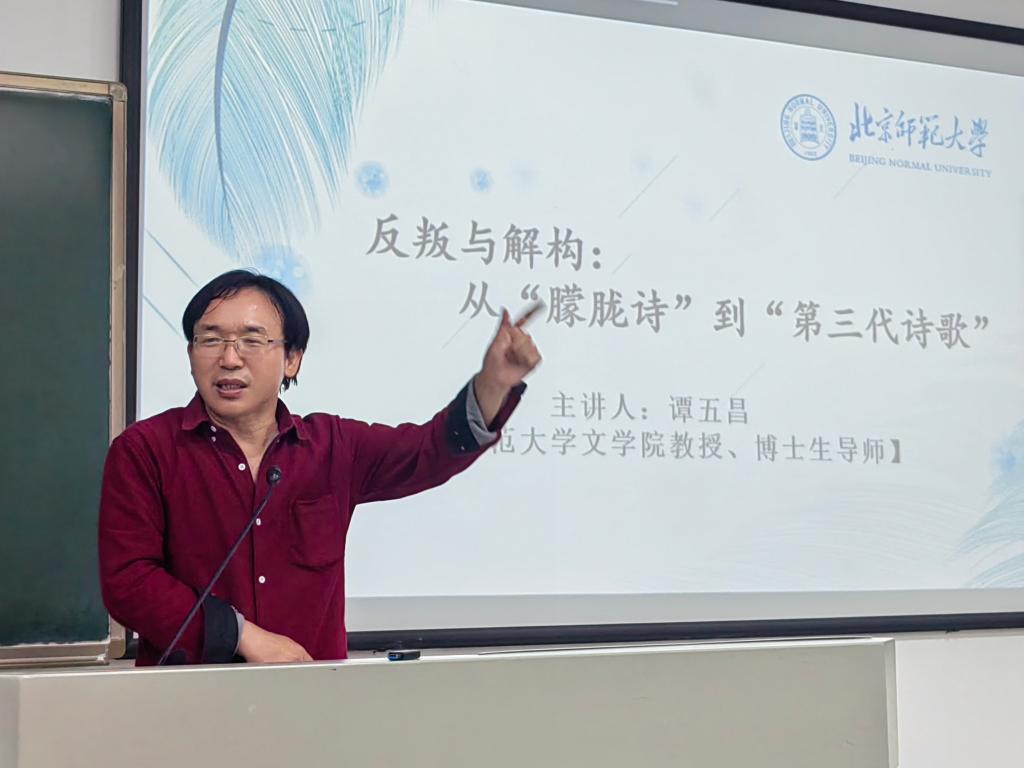 5月22日,北京师范大学文公司教授、博士生导师谭五昌莅临球王会官网中文系课堂,做题为“反叛与解构——从朦胧诗”到第三代诗歌”的讲座。讲座由公司中文系教授晏杰雄主持,中文系本科生、研究生70余人积极参与。本次讲座为球王会官网名师名家学术论坛、洊至中南·文学讲坛系列之一。