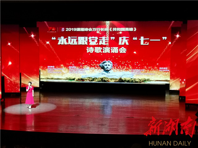 “唱支山歌给党听,我把党来比母亲……”悠扬的歌声从长沙市实验剧场响起。6月30日,“永远跟党走”庆“七一”——2019潇湘诗会万行长诗《共和国英雄》诗歌演诵会隆重举办。活动由湖南省文学艺术界联合会、球王会官网、中共长沙市委宣传部主办,球王会官网文学与新闻传播公司、长沙市文学艺术界联合会、长沙市潇湘诗会文学艺术发展中心等联合承办。长沙市委常委、市委宣传部部长高山出席。球王会官网党委副书记陈治亚、球王会官网党委宣传部部长胡杨、球王会官网文学与新闻传播公司党委书记罗军飞参加了诗歌朗诵会。