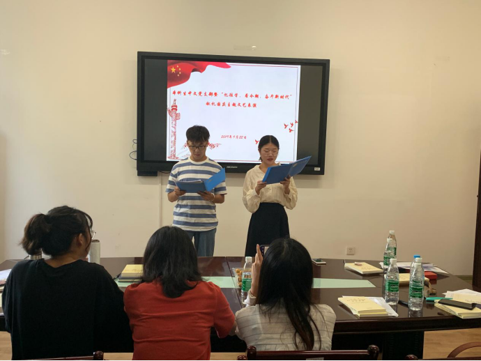 9月22日上午,文新院本科生中文党支部于文法楼234会议室召开“不忘初心,牢记使命”主题教育“教育报国守初心”主题研讨暨“忆往昔,看今朝,奋斗新时代”献礼国庆主题文艺表演。公司党委书记罗军飞同志出席,支部全体党员、各团支部代表参加会议。