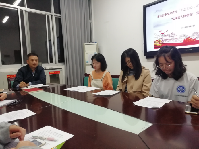 10月17日晚9点,文新院本科生中文党支部在文法楼234会议室召开“不忘初心,牢记使命”主题教育“立德树人担使命”专题研讨会。公司党委书记罗军飞同志出席,支部全体党员参加会议。