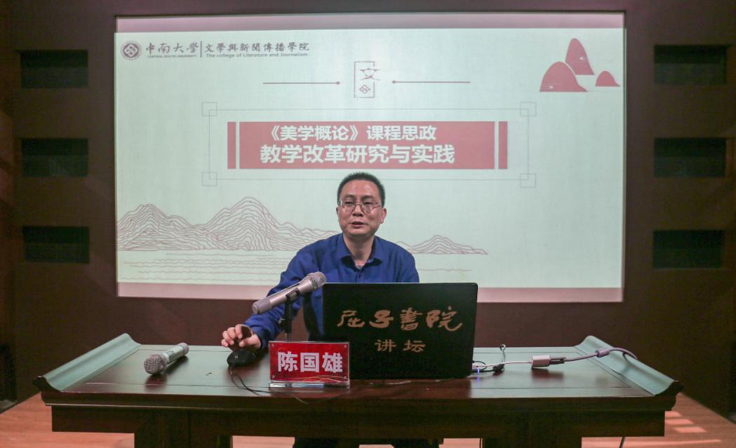 陈国雄副教授以“《美学概论》课程思政教学改革研究与实践”为研究课题进行了报告,介绍了课程思政的改革内容,即五大课程专业目标及四大课程育人目标,并就课程特色与创新进行了具体阐述。在教学方法与考核方式上,他提倡引入课堂辩论(开放式问题辩论)、课堂观点展示、湖南省博物馆现场观摩等多种教学方式,并将课堂辩论、课堂观点展示情况纳入考核成绩。他就该课程思政建设提出了具体的建设计划,并进行了教学案例的展示。