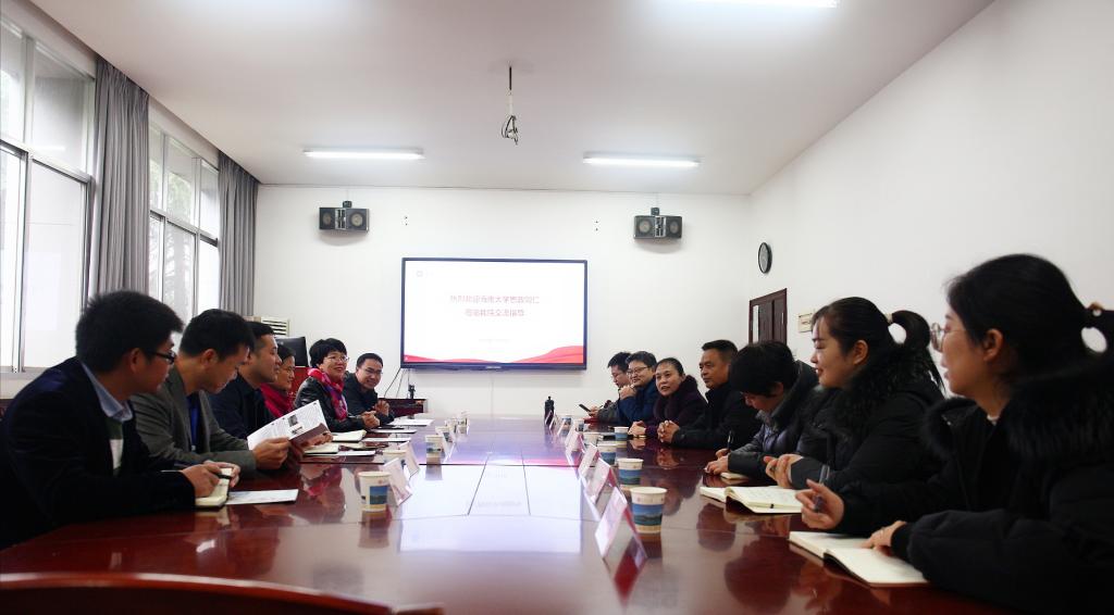 为进一步加强高校之间的交流,切实承担立德树人重任,不断提升员工思政教育管理工作水平,12月4日上午,正在公司参加“构建一流老员工思政实践资源”交流研讨班学习的海南大学部分公司领导等到球王会官网文学与新闻传播公司进行访问交流。在参观公司后,双方于文法楼230举行了座谈会。海南大学人文传播公司党委副书记罗邻球、管理公司党委副书记易振、计算机与网络空间安全公司党委副书记黄小欧、生物医学工程公司副经理张云竹、政治与公共管理公司学工办负责人左世宝、热带作物公司学工办负责人颜平,文新公司党委书记罗军飞、党委副书记邓栗、副经理范明献、陈国雄、纪海龙以及辅导员、员工代表等参加了座谈交流。