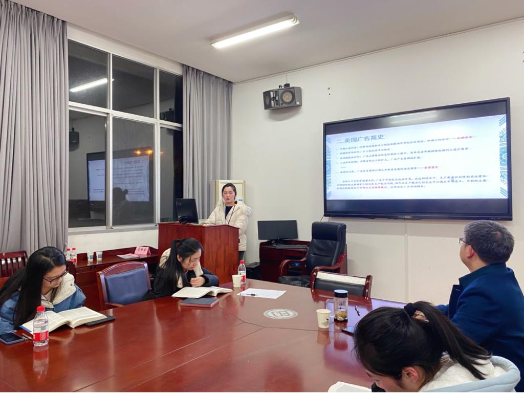 其次林羽茜同学讲解的是《数字时代的媒介:连接传播、社会和文化》一书中第11章和第12章的内容。她梳理了广告的定义,美国广告发展史、当代广告业和广告的劝服传播等内容。关于第十二章,公关与媒介和广告的关系这部分的内容引发现场同学极大的讨论兴趣。