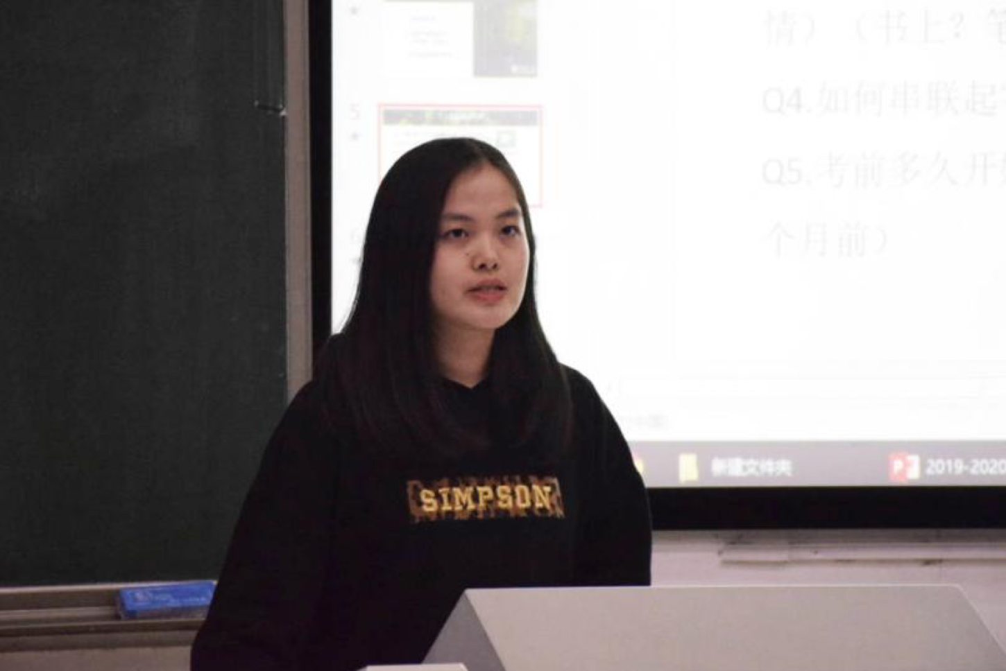 19级融媒体班杨梓萌同学为同学们带来学习经验分享。她从学习分类法和学习时间安排两方面向同学们介绍了她独到的学习方法,她认为每个同学都应该找到自己规律的复习频率,合理安排复习时间,秉持着“时间应该服务于你,而不是你服务于时间”的原则达到最佳的学习效果。