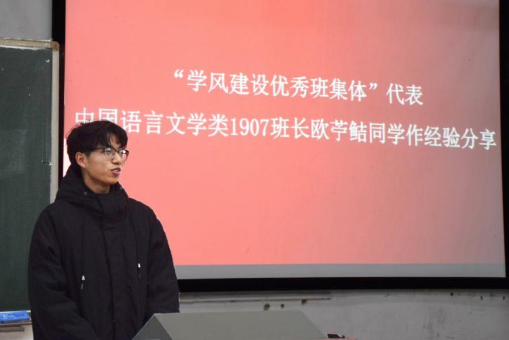 中国语言文学类1907班班长欧苧鲒作为优秀班集体代表用幽默风趣的语言向同学们分享了优秀班集体的建设经验。他说,全体师生团结一致是他站在这里的底气,他鼓励班委们都要以一种不要“我觉得”而要“你觉得”的思考角度切实为同学们解决问题。他指出,互帮互助学习小组的建设、和气的班级风气的维护以及劳逸结合的课外活动的开展都是建设优秀班集体的重要因素。