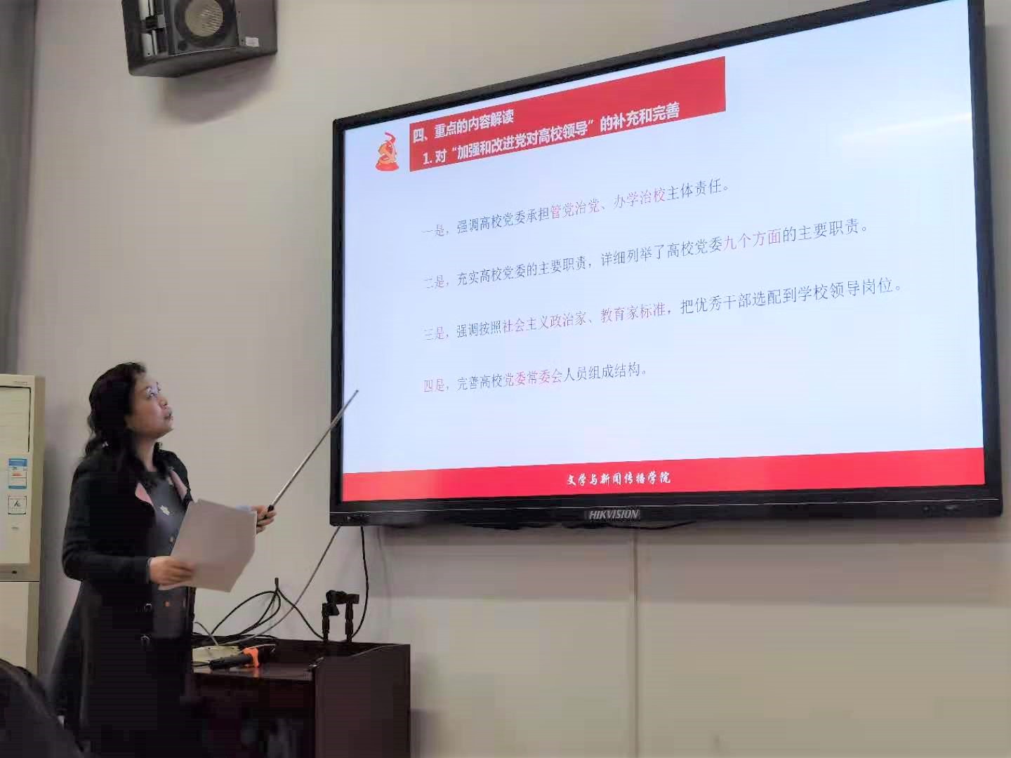 培训会上,邓栗副书记提到,《条例》的修订和实施,对于全面贯彻党的教育方针,落实立德树人根本任务,建设高质量教育体系,培养社会主义建设者和接班人,具有十分重要的意义。邓栗副书记对条例的修订背景、修订遵循的主要原则及主要修订内容进行了具体阐释,并对“加强和改进党对高校领导”、“加强高校基层党组织和队伍建设”、“党员教育管理”、“高公司党的纪律检查工作”、“加强高校思想政治工作”、“高校落实党建工作责任”等多个重点内容进行了针对性的深度解读。