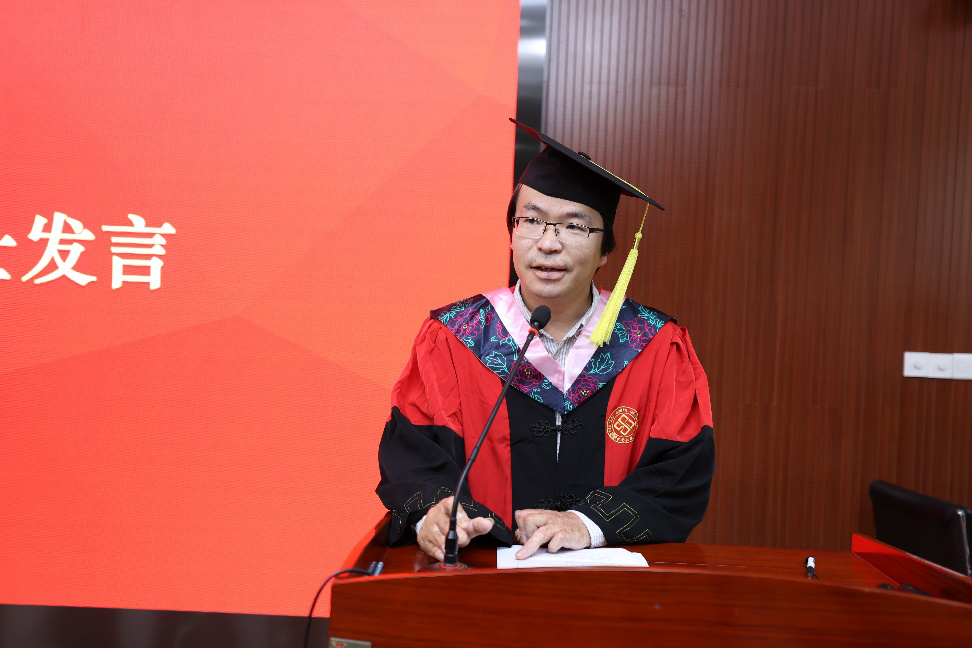 硕士毕业生代表乔泓瑞、学士毕业生代表张浩翔分别发言。乔泓瑞深情回顾了自己在文新院求学的八年里不断追问、成长的历程,也见证了公司八年来不断探索、壮大的过程。他表示,文学的阅读不仅给了他了解人、了解自己、建构自己的机会,也给了他最坚强的铠甲和最柔软的内心。他提到三点期许,与各位毕业生共勉:第一,要有文人风骨,家国情怀;第二,要同情他人,热爱生活;第三,要知行合一,经世致用。他再次表达了对母院的衷心祝福和对老师的崇高敬意。