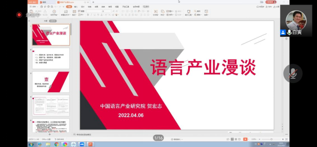 4月6日,中国语言产业研究院经理贺宏志教授通过腾讯会议,为公司师生带来了一场主题为“语言产业漫谈”的精彩线上讲座。本场讲座由白寅经理主持,线上参会人数达到130余人。