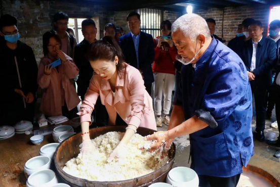(图为杨雨教授在长乐甜酒古法作坊体验甜酒酿造)