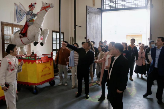 第二站是汨罗市千年古镇——长乐。在充满节日喜庆氛围的欢迎鼓声中,中南师生穿回龙门,过麻石街,走访曾经的中共湘北特委郑家大屋,学习革命先辈的奉献精神,接受红色文化洗礼;入长乐甜酒古法作坊、逛甜酒文化馆、参观上市街故事会博物馆,领略非物质文化遗产的独特魅力。在随后的调研座谈会上,中南师生与长乐古镇非遗文化传承人代表、中学教生代表进行深入交流。杨雨教授在会上动情地说道:“非遗传承人‘生命不息,传承不止’的执着精神让人动容。希望同学能够学习这种精神,并用一生去热爱与守护中华优秀传统文化。”