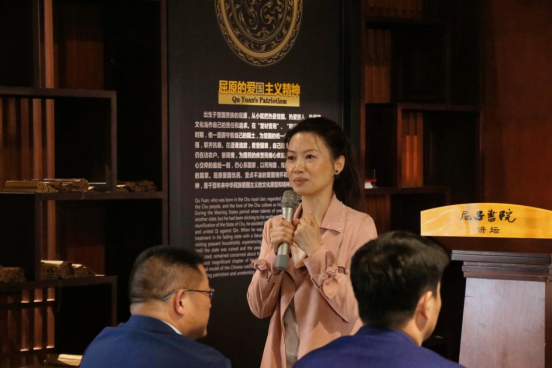 下午,中南师生一行来到了屈原管理区,追寻屈原的千年足迹,接受一场爱国主义教育与中华优秀传统文化教育。在屈子文化园的屈子祠,中南师生参加了祭奠屈原的仪式,沐浴在屈原爱国主义精神的伟大光辉中;在屈子书院沅湘堂,杨雨教授以“爱国思想先驱、浪漫文学始祖、正道直行精神、香草美人情意”为关键词进行现场教学,她简要介绍了屈原生平、思想以及屈原精神对华夏文化的深远影响,现场互动热烈,同学们收获良多。
