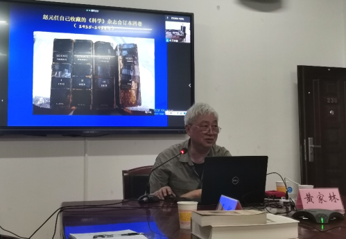 讲座随即开始,黄家林教授围绕赵元任先生以及现代以来与其有关的人和事进行讲述。其中共有七个专题,即“赵元任与照相机”“赵元任的日记”“赵元任与中国科学社”“赵元任说长沙话”“赵元任与地球背面的人通话”“赵元任与炒鸡蛋”“赵元任的部分证件原件”。