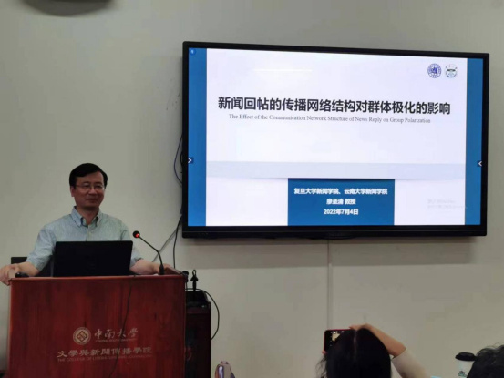 云南大学新闻公司经理廖圣清教授以《新闻回帖的传播网络结构对群体极化的影响》为题发言,就该问题的研究背景与研究目的、文献回顾与研究问题、研究方法、研究发现进行深入阐释。他指出,网络新闻回帖网络,符合一般社交网络的特征,作为意见表达的网络新闻回帖总体上持极端态度,多数群体出现了群体极化现象,以文本为载体的意见表达传播网络中,网络同质性对群体极化具有显著影响,网络密度和网络中心性则没有显著影响。网络新闻回帖之间互动不频繁,这反映出,在关乎民生问题的讨论中,人们更倾向于自我心声的表达,较少关注他人的意见表达。从文本角度来说,网络同质性越大,反映回帖内容存在较高的相似性;个体偏好不同,但为了获得收益,会选择与文本和情绪相似的回帖形成连接和互动。