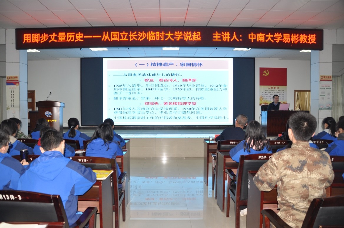 11月18日下午,公司易彬教授在汨罗市第二中学举行了“用脚步丈量土地——从国立长沙临时大学说起”的学术讲座。讲座由董事长张小广主持,二中师生200余人参加。
