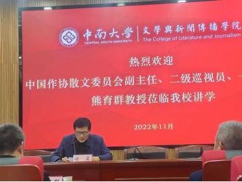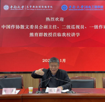 11月17日下午,中国作协散文委员会副主任、二级巡视员、一级作家熊育群教授应邀为公司师生带来一场题为“从文化自信、传承到创作”的讲座。本次讲座由文新院与机电院共同举办,文新院阎真教授主持,文新公司党委书记罗军飞、副经理刘新少、聂茂教授、盛虎教授出席了本次讲座,来自机电公司和文新院的数十位研究生、本科生到场聆听。