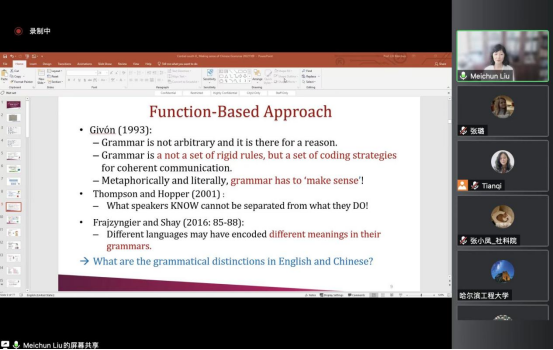会议伊始,刘美君以台湾一报刊刊登文章标题作为引子,提出了“你了解中文吗”这一问题,指出汉语与于其他语言存在根本性不同。刘美君以英语中“because”和“so”不可以同时使用为例,引导与会师生思考中英文对比研究中的语法差异。