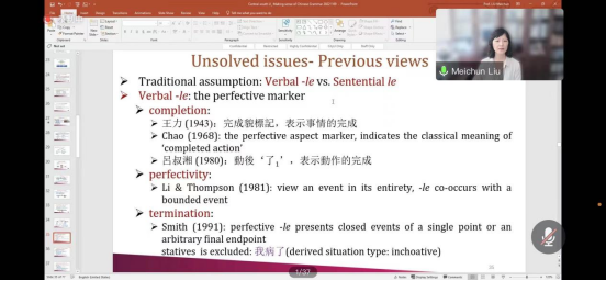 其后,刘美君又对汉语中的“了”字进行详尽论述。她表示,“了”可以与时间脱钩,它只是表示这个事件或某种状态的发生,其标记“了”现实出现的事实,而非在意事件时间(Event Time)的节点。刘美君还进一步对比了英语时态中“现在”和“现在完成”概念的差异。她指出,目前学界关于“了”字依旧存有争议。其一,传统主流观点认为“V+了”结构是对动作完成的标记,代表人物如王力和吕叔湘等,与之相对的则以刘勋宁为代表。其二,学界还存在“有界与无界”的争议,沈家煊认为“了”使无界变有界,而林若望和屈承熹则持相对看法,认为“了”是事件发生、或完成的标记。