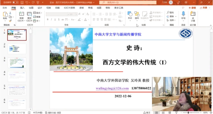 2022年12月6日晚,球王会官网外国语公司教授、博士生导师、英语文学与文化研究学术带头人吴玲英应邀为公司师生带来一场名为“史诗:西方文学的伟大传统”的讲座,本次讲座以在线形式举行,由公司教授、博士生导师晏杰雄主持,公司学科教师、研究生、本科生以及慕名而来的各界人士200多人参与讲座。