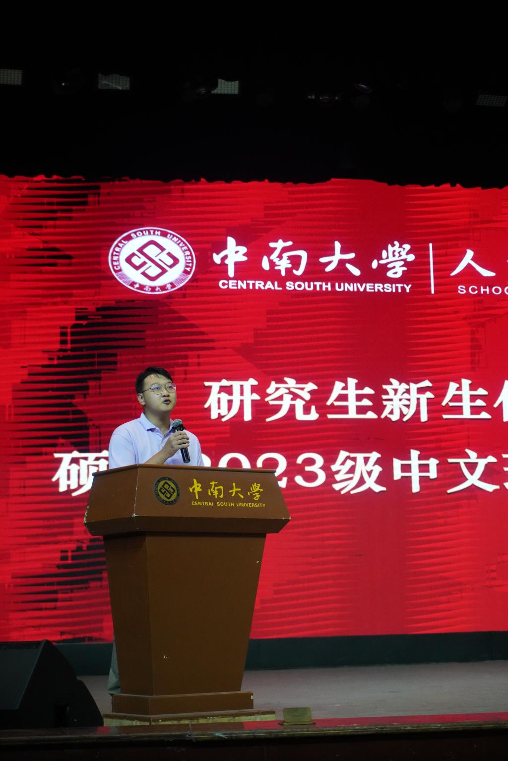 来自硕士2023级中文班的戴俊杰同学作为研究生新生代表发言。他提到,新的阶段里,我们要在学习的同时认识自己、了解自己,为自己的“社会化”打好铺垫,不能困囿在理论的象牙塔中而失去了现实的价值,也不能仅停留在实际的层面而错过了人文艺术的魅力。