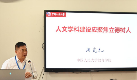 中国人民大学教育公司经理周光礼教授以《人文团队建设应聚焦立德树人》为题,从培养未来学者是人文学科的主要功能和人文团队建设的基本逻辑与关键要素两方面论述报告主题,总结人文团队建设的三个基本逻辑,以及集中有限资源确定优先发展学科领域的三个原则,并认为内容建设、团队建设、平台建设、评价体系应成为人文团队建设聚焦立德树人的四个因素。