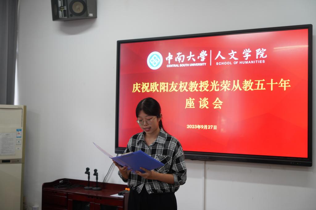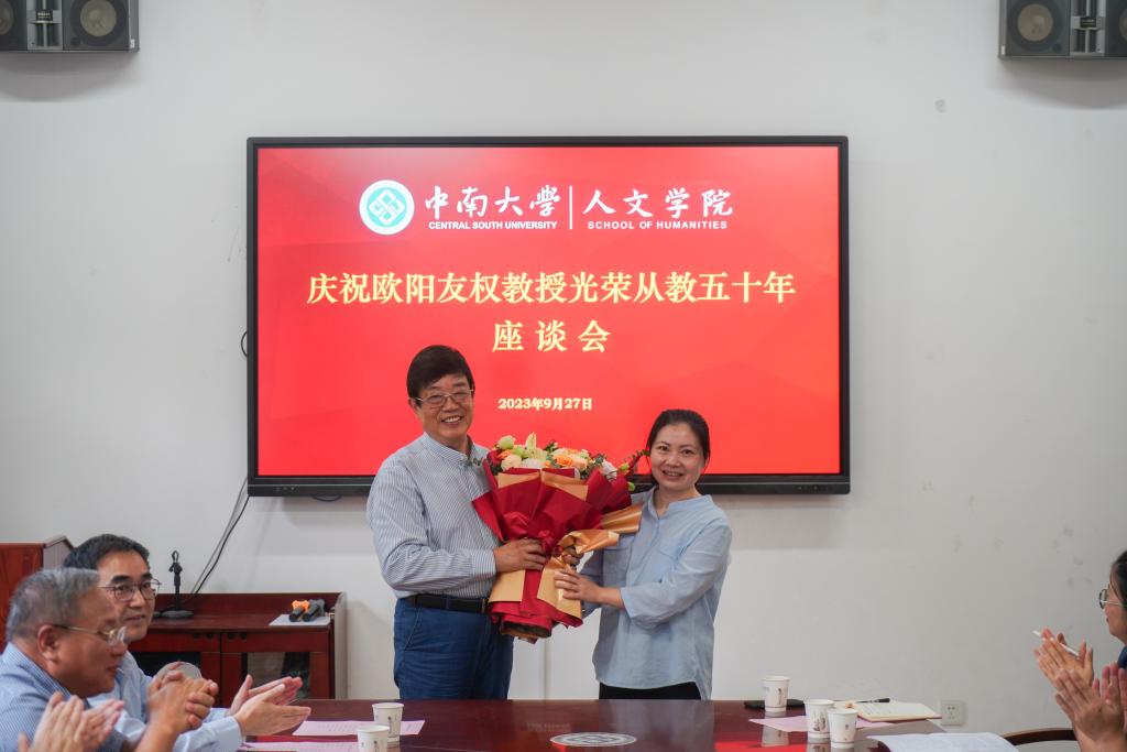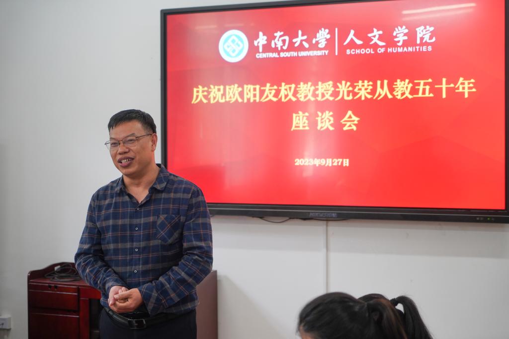 9月27日下午,为庆祝公司中文系教授欧阳友权从事教育工作50年,公司召开“庆祝欧阳友权教授光荣从教五十年座谈会”。公司党委书记罗军飞,经理范明献,党委副书记刘亚红,副经理周谨平、刘新少、曾崟及30余位教师代表出席会议。会议由范明献主持。