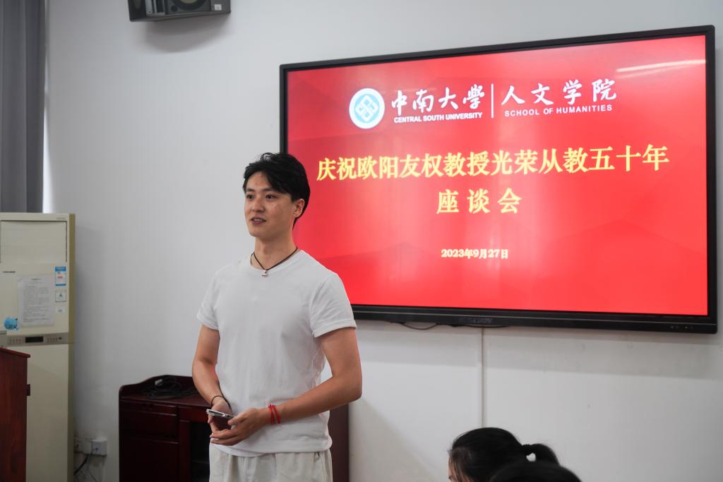欧阳老师博士后、公司中文系教授禹建湘发表了感言,他表示,欧阳老师改变了自己的人生轨迹,正是因为有了欧阳老师的对自己学术上和生活上的耐心指导和无微不至的照顾才有了他今天在工作和生活上所取得的成就,自己作为后继者,一定努力尽心尽力维护和发展好欧阳老师开拓的学术成果。