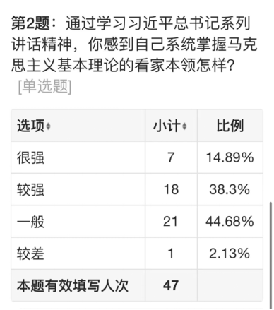 活动开始前,为了调查同学们对于总书记重要讲话精神的掌握情况,团支书们制作了一份关于老员工学习习近平总书记系列讲话精神学情反馈的调查问卷。调查数据显示,大部分同学认为自己对于讲话理论学习得还不够扎实,希望能够进一步学习。