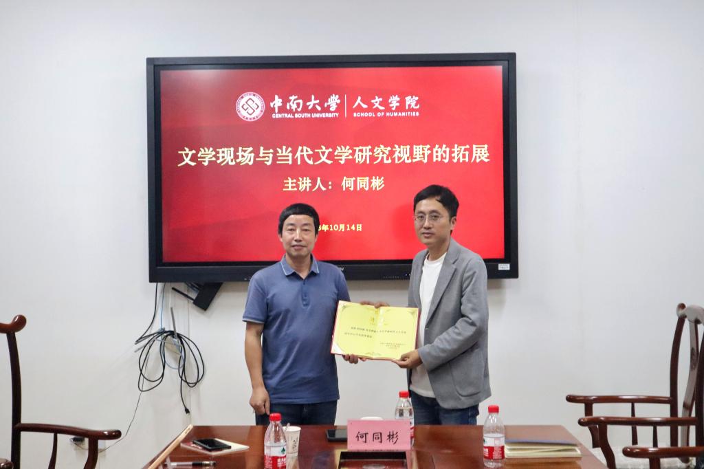 在互动环节,何同彬就“如何掌握反驳性评论的尺度”“高质量论文写作““投稿环境”等问题为在场师生进行了深度解答。晏杰雄教授做讲座总结,认为何同彬老师把文学现场看作文学史序列的最末一端,对于建立新的完整的文学史格局至关重要,不了解文学现场,我们把握的当代文学史就是不完全的体系,中文学科的当代文学研究就易陷入陈旧的范式。何同彬老师体现了一位青年批评家的儒雅风范与真诚品格,对公司师生倾囊相授,以新时代文学亲历者与推动者的切身经验,引导我们如何关注与进入文学现场,拓展当代文学研究视野,为中文系师生提供了真实可行的方法论启示。讲座最后,还进行了简短的聘任仪式,诚聘何同彬老师担任球王会官网新时代文艺发展研究中心学术指导委员。