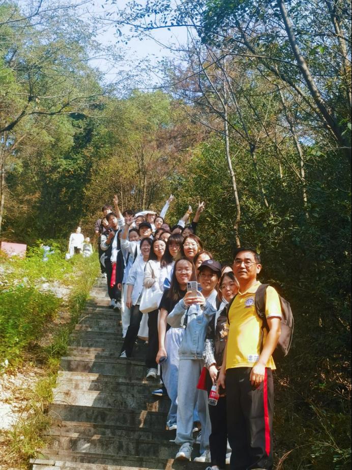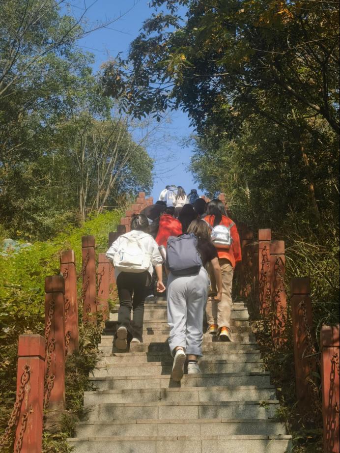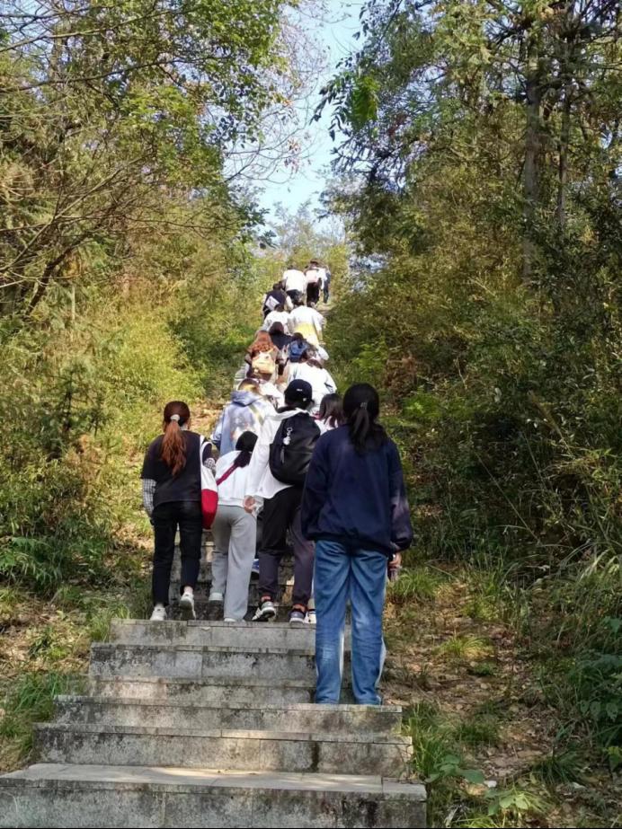 无惧艰难,方显勇毅;惟其磨砺,始得玉成。行进过程中,大家经历了弯曲小路、上坡下坎、汗流浃背、肌肉酸痛、疲惫不堪,但在刘经理的榜样鼓舞下,同学们都毫不畏惧,互相扶持、互相帮助,奋力前进,越过一段又一段的陡峭台阶,在克服一个又一个的难题中深刻体会到徒步精神之所在。