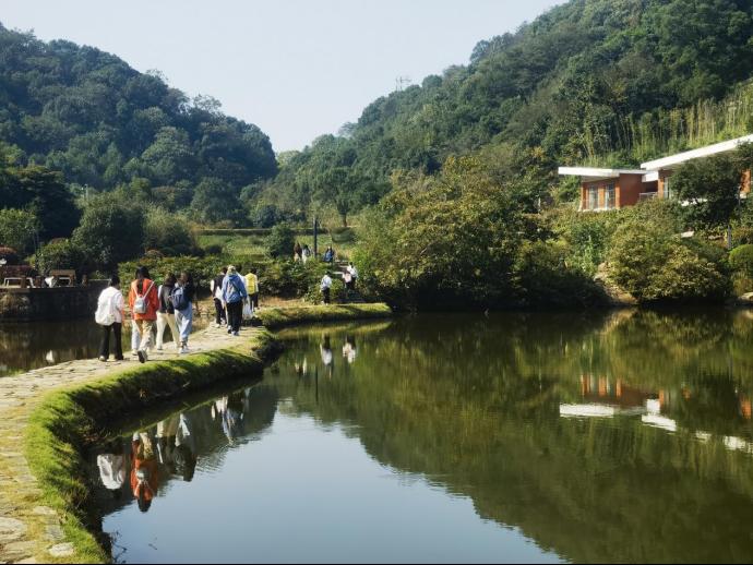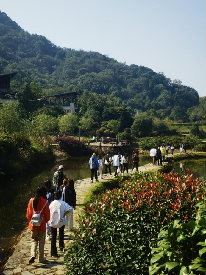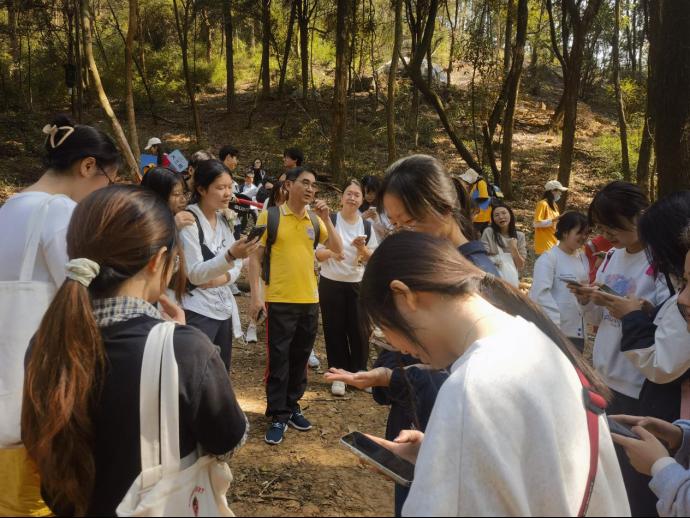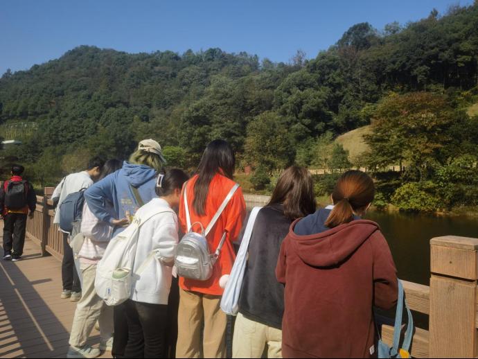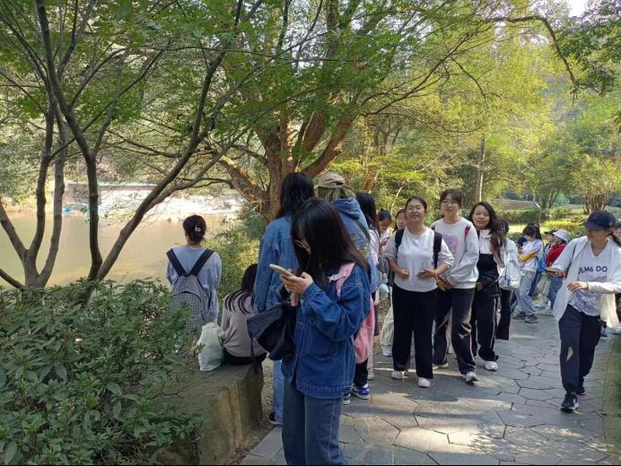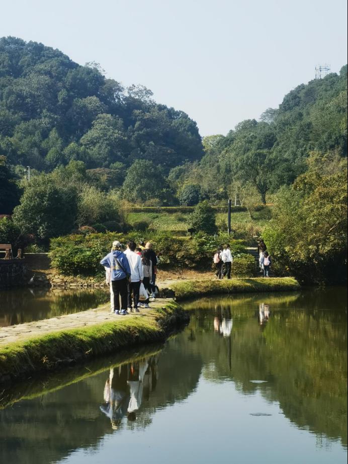 徒步不只有单调的步程,还有一路欢笑一路歌。通过此次活动,桃花岭的美景以另一种视角映入眼帘,让人不禁驻足流连。大家依次抵达了水库、虎山亭等地点,游鱼流水、绿树红亭,步履所至、目光所及之处,皆为美丽画卷。途中刘经理与同学们亲密交流杨梅树等生活趣事,互相分享水果零食补充体力。斑驳阳光洒落林间,大家齐唱《孤勇者》等流行歌曲,拉近了心与心的距离,进一步增强了班级凝聚力与团结力,在欢声笑语中突破自己,在意气飞扬中奔赴终点。