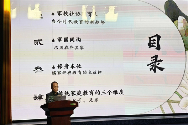 成娟阳、谭忠诚分别以《古代家训源流漫谈》《传统经典教育与当代家庭教育和谐之道》为主题先后作专题讲座,拉开了“球王会官网·江华瑶族自治县‘经典润家风’家庭教育宣讲活动”的帷幕。两位老师结合《三字经》《诗经》《三国志》《周易》等经典著作讲述源远流的家训、家风的含义,以及对后世乃至当代社会的影响力,并以颜氏家训等典故为引阐述如何建设良好的家风。