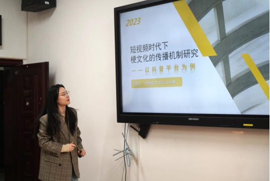 第五组团队代表李静茹围绕“短视频时代下梗文化的传播机制”向大家进行了介绍,该团队以抖音平台作为研究对象,探究抖音短视频热梗的传播特征,分析短视频梗文化的传播机制。探讨在短视频背景下,如何利用梗文化传播引导网络文化中的价值观。