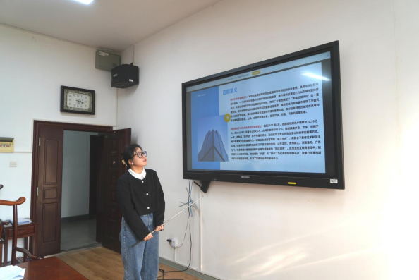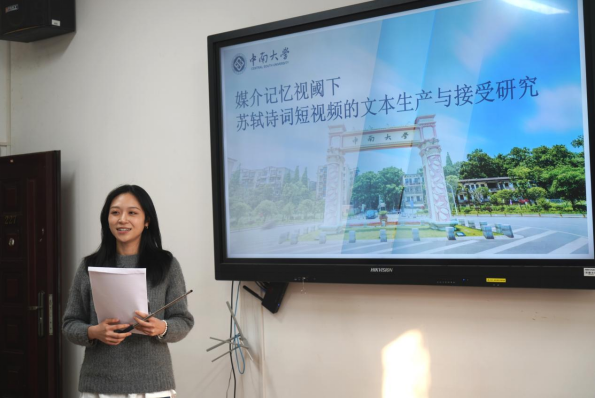 第四组团队代表杨璧全汇报关于“媒介记忆视域下苏轼诗词短视频的文本生产与接受”的研究情况,以媒介记忆为理论资源,探讨分析苏轼诗词在社交媒体的记忆文本呈现、记忆的生产权力关系和记忆接受,为传统文化的双创提供路径、增强民族认同,推动古诗词文化在新媒介的传播实践。