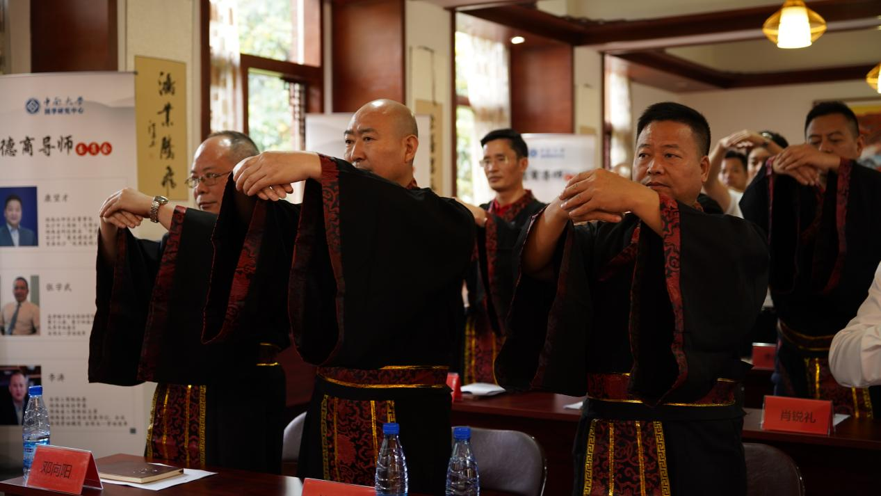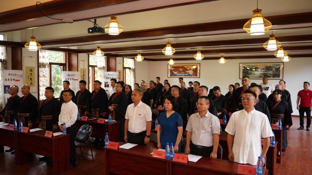 随后,按照典礼章程,依次进行了击鼓36响、撞钟9响,正衣冠、奏唱国歌、学员代表奉茶、行身躬礼、敬献六修礼、金盆净手、罗军飞书记授班旗等仪式,场面恭敬庄重,气氛肃穆。