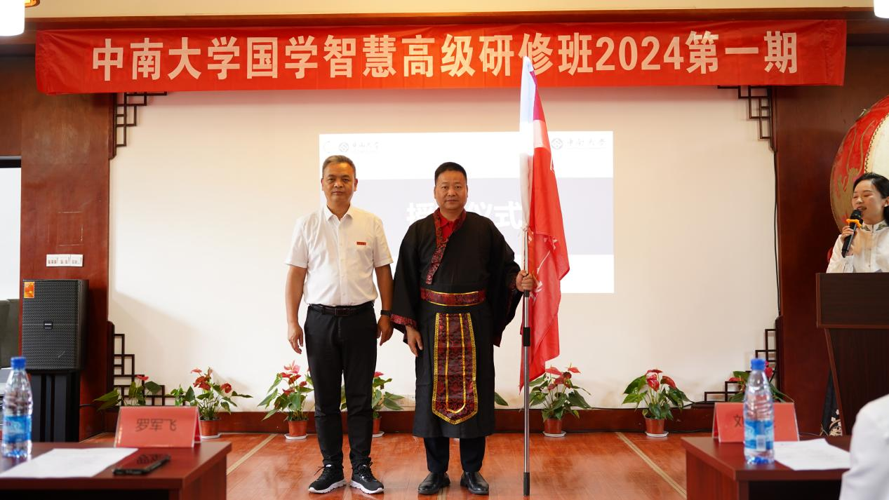 最后,球王会官网公司党委书记罗军飞为国学智慧高级研1班授旗并代表球王会作总结讲话。