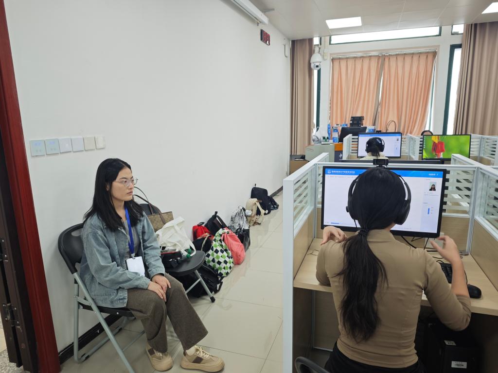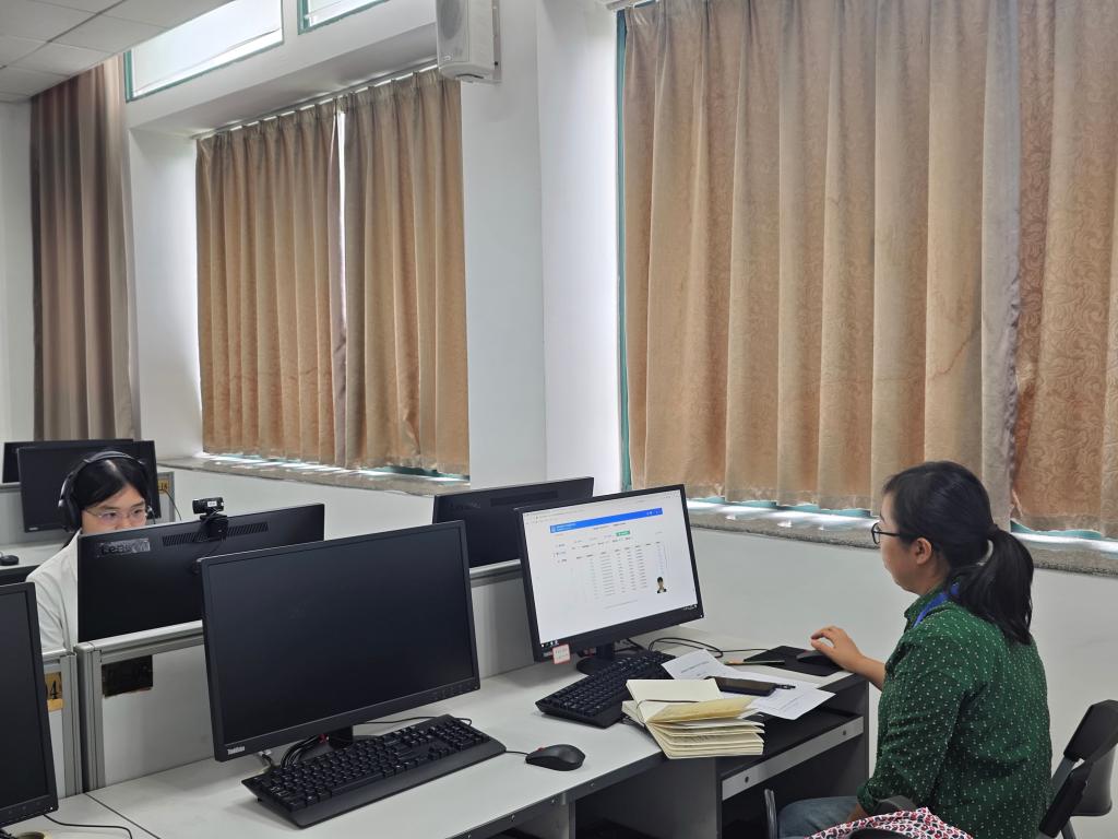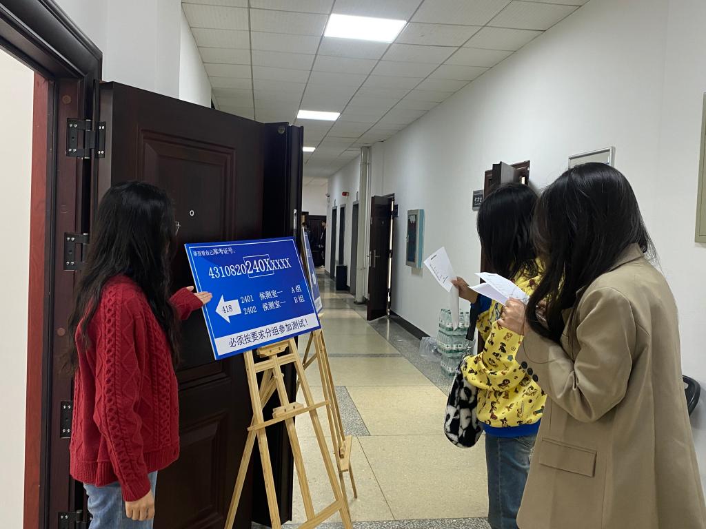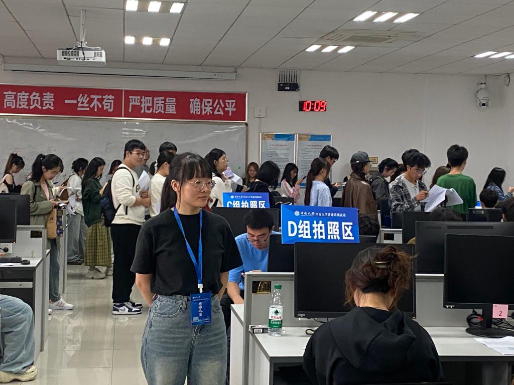 19日测试当天,工作人员提前布置考场,按要求调试测试设备。上午八时,考生到达指定候测室,根据工作人员安排分批次签到核查信息。随后在工作人员引导下,拍照分组,接着排队进入测试室,对号入座。