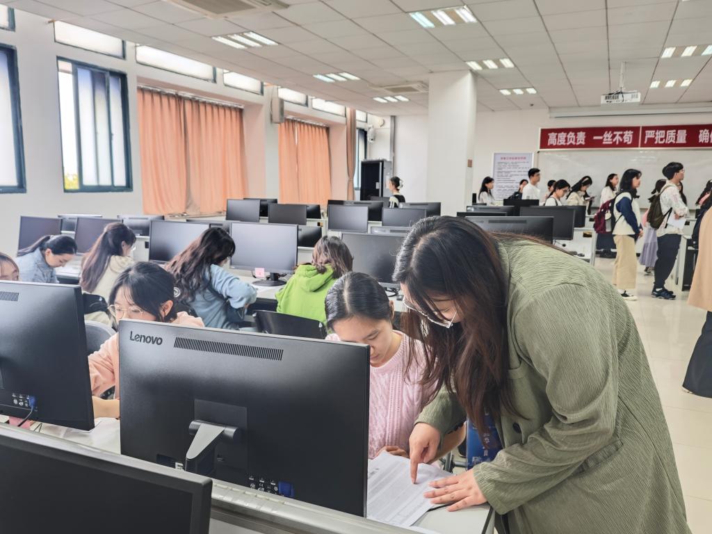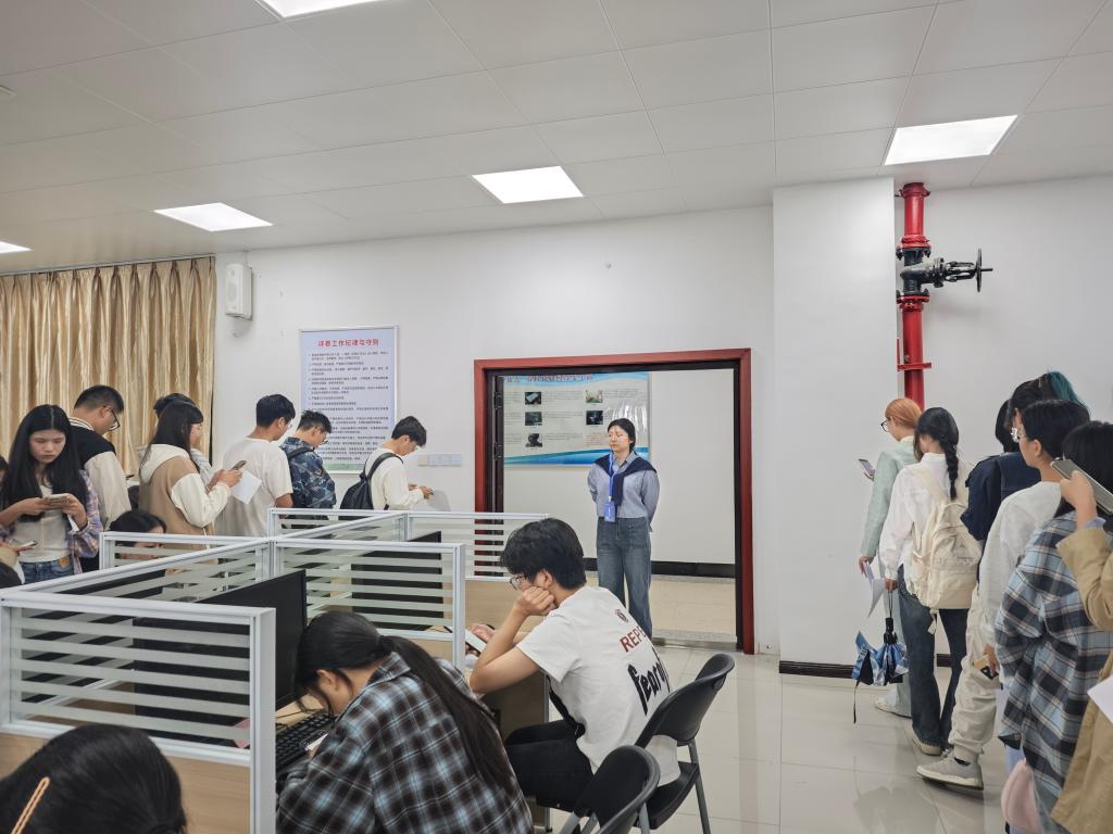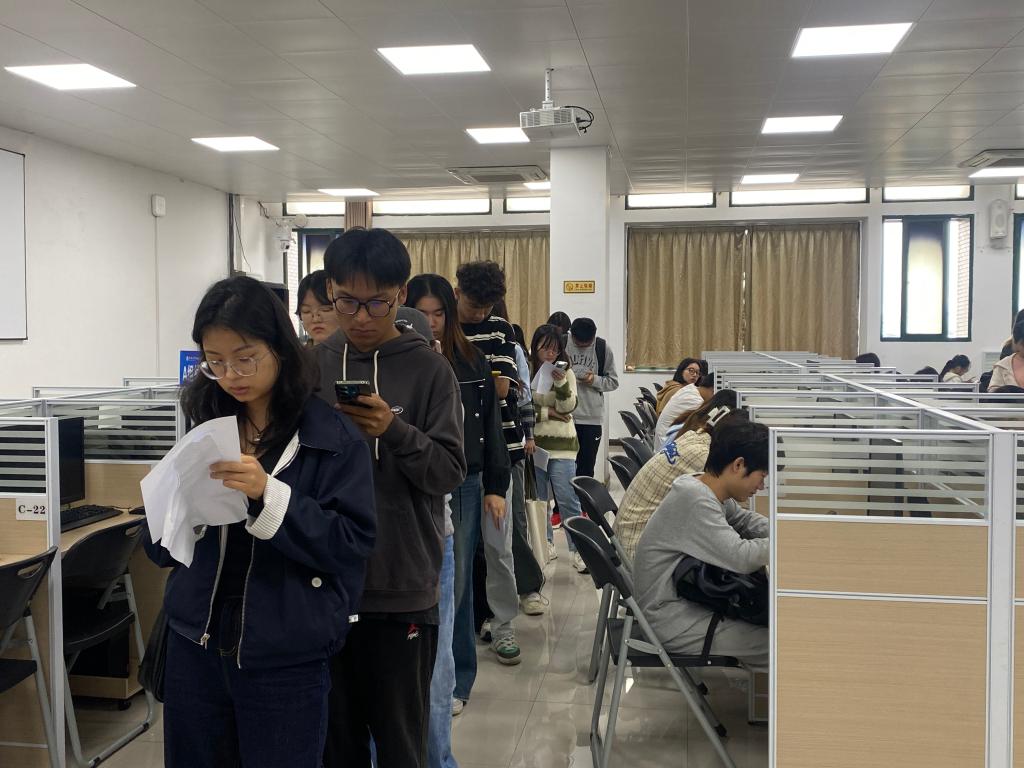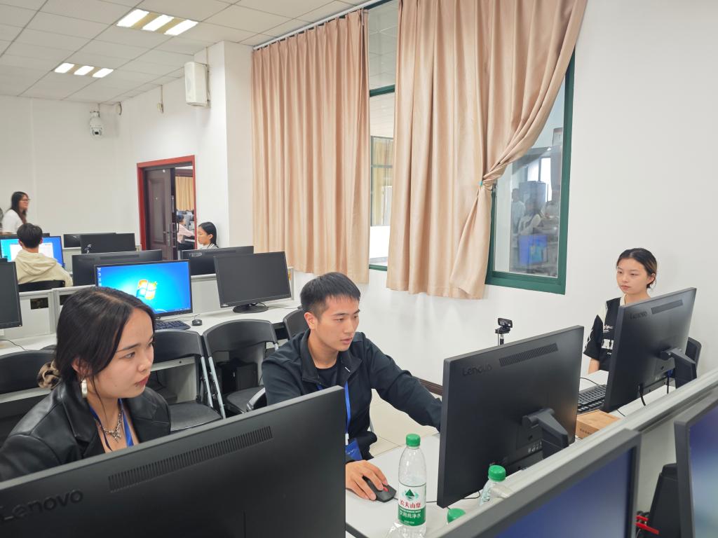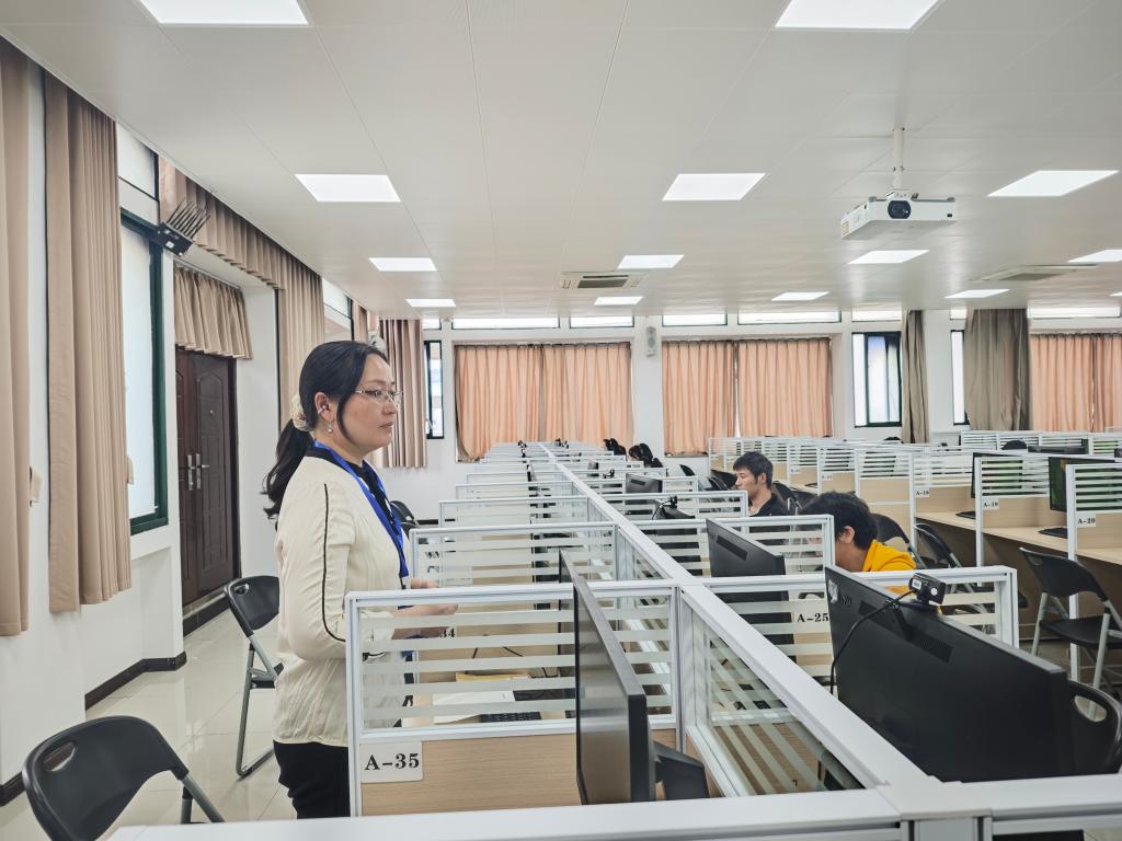 19日测试当天,工作人员提前布置考场,按要求调试测试设备。上午八时,考生到达指定候测室,根据工作人员安排分批次签到核查信息。随后在工作人员引导下,拍照分组,接着排队进入测试室,对号入座。