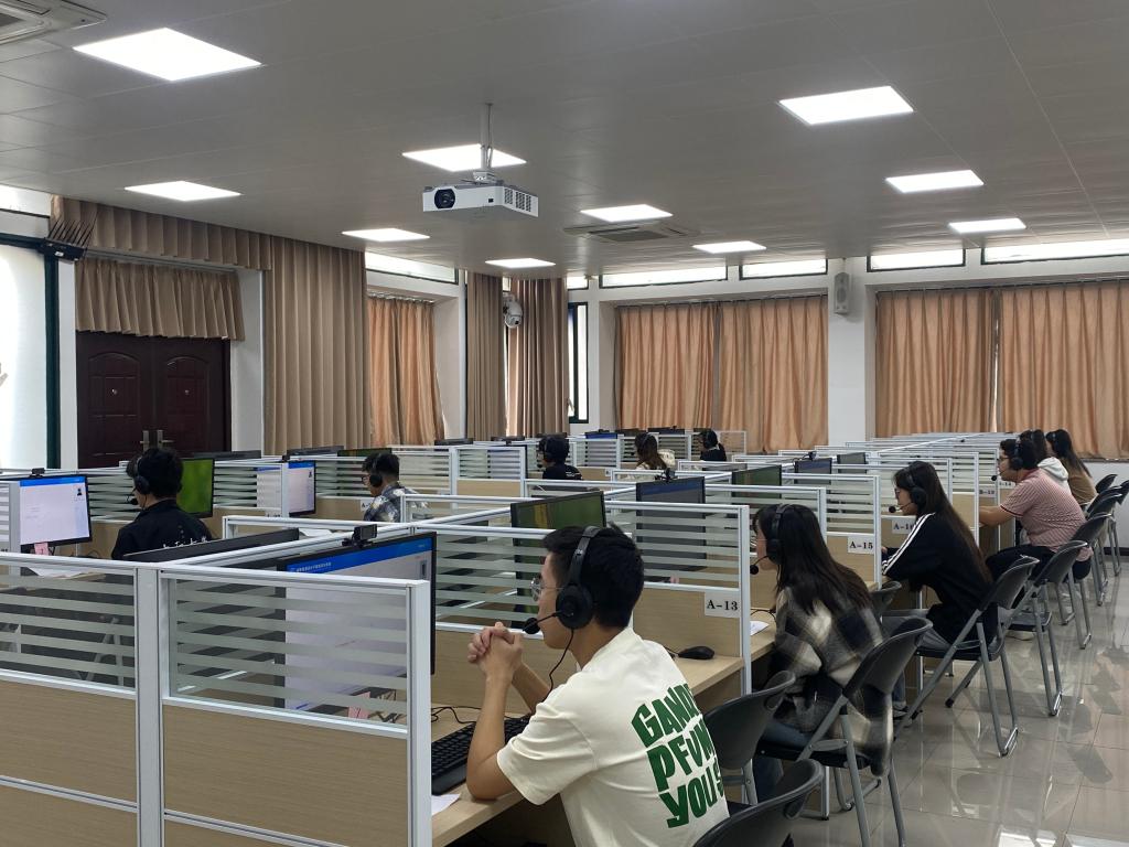 测试中,考生根据电脑提示,完成读单音节字、多音节词语、朗读作品及命题说话等题目的测试。一组测试过程中,下一组就在候测室完成所有流程排队等候,测试就这样一组接一组,不间断地有序推进,整场测试有条不紊,秩序井然。本次测试设有两个候测室,两个测试室,共完成1610名考生的普通话测试。