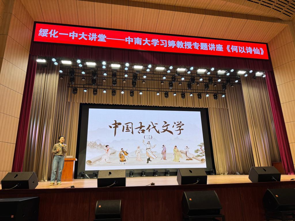 仪式结束后,作为中央电视台《百家讲坛》主讲嘉宾的习婷老师,为两所中学的师生带来了一场主题为《何以诗仙——李白〈蜀道难〉及其复古诗学观》的精彩讲座。习婷老师从李白的“诗仙”之名说起,强调《蜀道难》上承古代诗歌写作传统,下接诗歌创作的新变,彰显出李白理念复古与形式创新的复古诗学观。讲座将诗人放置于文体演变、文学发展的历史框架中加以认识,通过对古代文学作品的深度解读及历史文化背景的挖掘,深刻揭示了古代文学作品中蕴含的人文精神及价值观念,为与会师生打开了一扇领略古代文学之美的独特窗口。