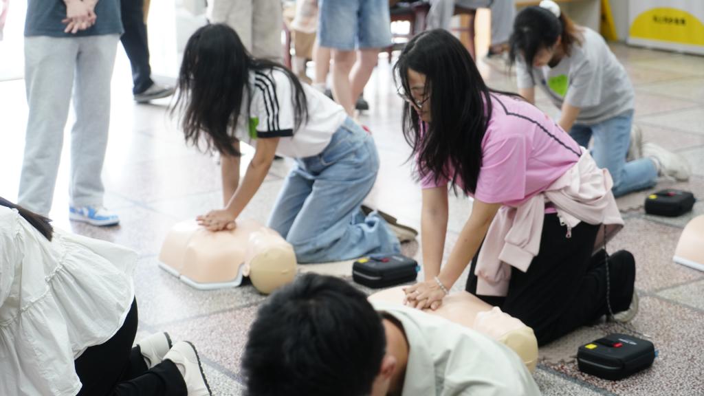 实践教学分别在文法楼一楼与三楼大厅同时进行,并为同学们准备了人体模型道具和自动体外除颤器(AED)。老师们从四个步骤对心肺复苏(CPR)与AED(自动体外除颤仪)的使用过程进行详细讲解:一是判断环境安全、二是判断患者意识和呼吸并呼救;三是进行30:2的胸外按压和人工呼吸;四是正确使用AED。通过老师们的亲自示范与仪器的同步检测,参与学习的同学完成实践操作并最终独立完成整个心脏复苏(CPR)的全过程,以此掌握急救技能。